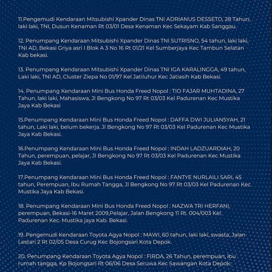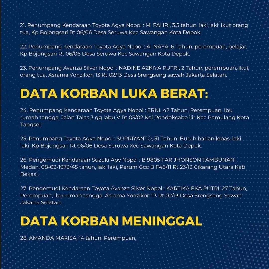 1. Amanda Marisa (13 Tahun), pelajar asal Jakarta Selatan, penumpang Toyota Avanza.