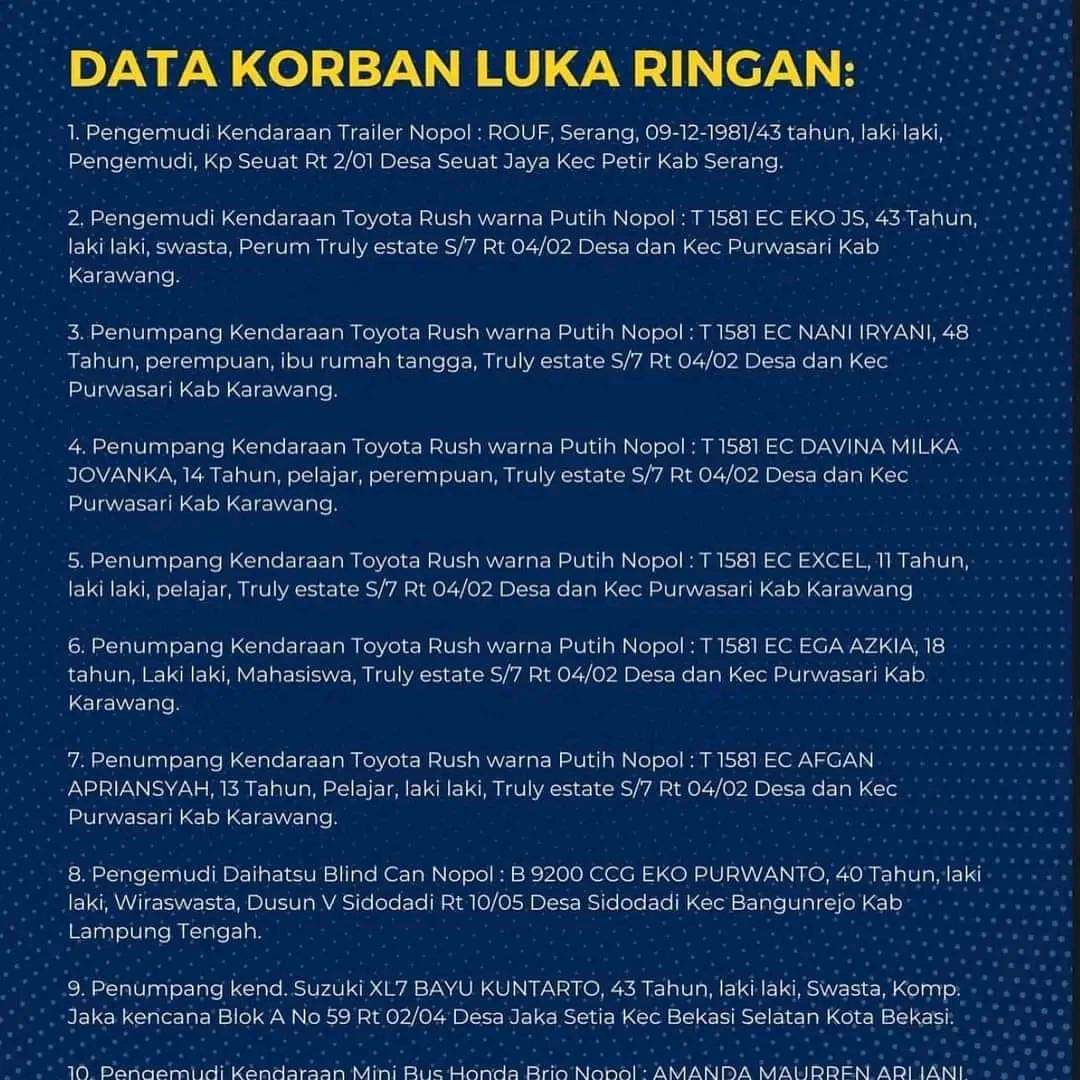 Kabidhumas Polda Jabar, Kombes Pol Jules Abraham Abast, menyampaikan pada Selasa (12/11/2024) bahwa jumlah korban mencapai 30 orang, dengan rincian satu korban meninggal dunia dan 29 lainnya mengalami luka-luka. Dari jumlah tersebut, terdapat 25 orang luka ringan dan empat orang mengalami luka berat.