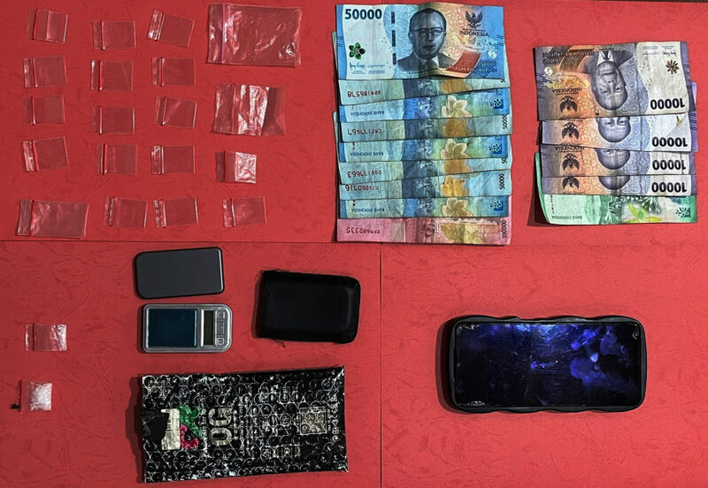 Selain meringkus seorang bandar sabu, petugas juga mengamankan barang bukti (BB) berupa 2 (dua) bungkus plastik klip berisi narkoba jenis sabu dengan berat bruto 0,73 (nol koma tujuh puluh tiga) gram, 3 (tiga) bungkus plastik klip kosong ukuran sedang, 16 (enam belas) bungkus plastik klip kosong ukuran kecil, timbangan digital, sarung timbangan digital, plastik warna hitam, handphone (HP) merek Oppo warna hitam, dan uang tunai sebanyak Rp 560 ribu.