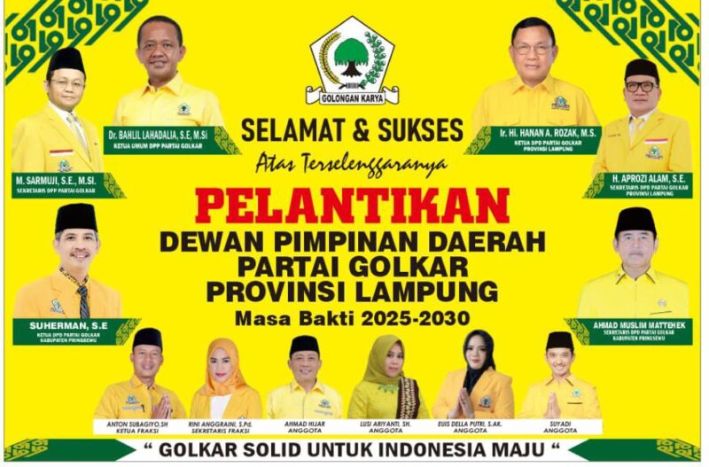 Prioritastv.com, Pringsewu, Lampung – Dewan Pimpinan Daerah (DPD) Partai Golkar Provinsi Lampung periode 2025–2030 resmi akan dilantik pada Minggu, 30 November 2025, di Hotel Novotel Bandar Lampung. Pelantikan ini akan dilakukan langsung oleh Ketua Umum DPP Partai Golkar sekaligus Menteri ESDM RI, Bahlil Lahadalia.